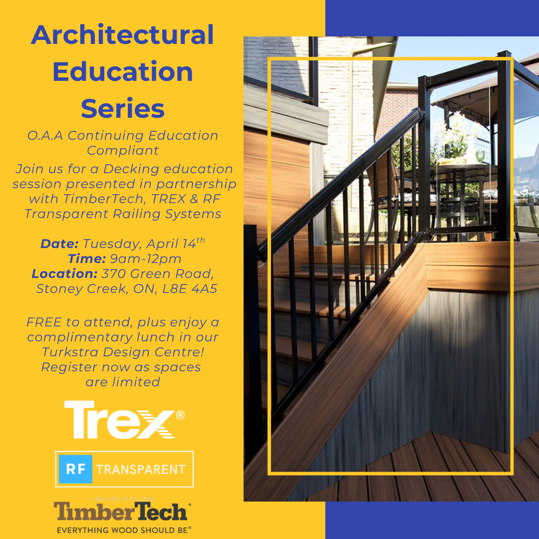 Please join us on Tuesday, April 14th from 9am-12pm at our Turkstra Stoney Creek location for a FREE education session about TimberTech PVC Decking and Aluminum Substructure, RF Transparent on their frameless glass railing system, and Trex composite decking. This education session is compliant with O.A.A Continuing Education credits, and a complimentary lunch will be served.This session will be hosted by Brent McLeod from TimberTech, Rob Glas from RF Transparent Railing, and Mike Stephens from Trex who will share practical insights from real-world applications.